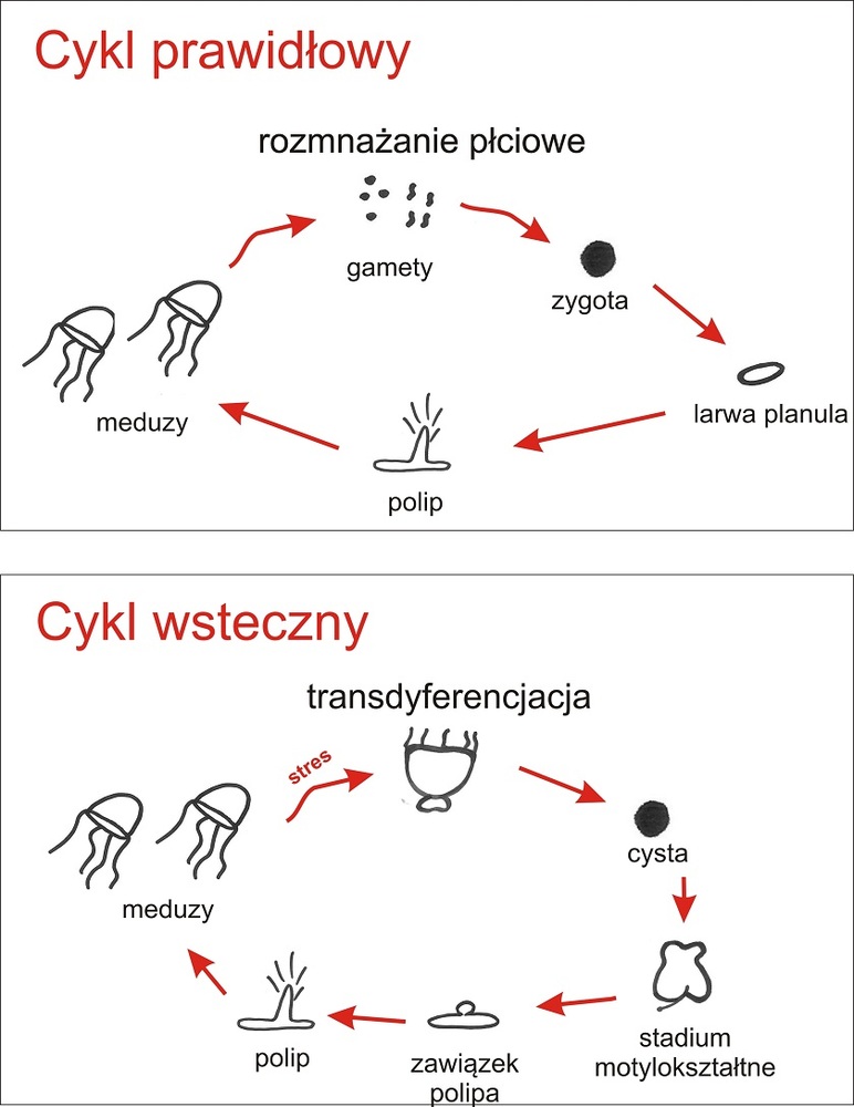 Pod koniec XX wieku doszło do niezwykłego odkrycia. We włoskim laboratorium student biologii morza prowadził badania nad Turritopsis dohrni (wcześniej nazywanym Turritopsis nutricula) – gatunkiem stułbiopława, maleńkiego parzydełkowca żyjącego w Morzu Śródziemnym (ryc. 1). Gatunek, który obserwował charakteryzuje się metagenezą, czyli przemianą pokoleń i występuje w dwóch postaciach: wolno pływającej meduzy rozmnażającej się płciowo lub osiadłego, bezpłciowego polipa. Cykl życiowy stułbiopława rozpoczyna wolno pływająca larwa – planula, która osiada na dnie i daje początek przytwierdzonej do dna kolonii polipów. Kolonia rozrasta się wskutek pączkowania, będącego rozmnażaniem bezpłciowym. Także wskutek pączkowania powstają postaci dorosłe – meduzy, które dorastają do 4,5 mm średnicy, a po osiągnięciu dojrzałości płciowej uwalniają one do wody jaja i plemniki. Po zapłodnieniu, do którego dochodzi w wodzie powstaje zygota, a z niej rozwija się larwa planula (ryc. 2 – część górna). Zwykle rozmnażanie płciowe jest zakończone degeneracją meduzy i śmiercią.