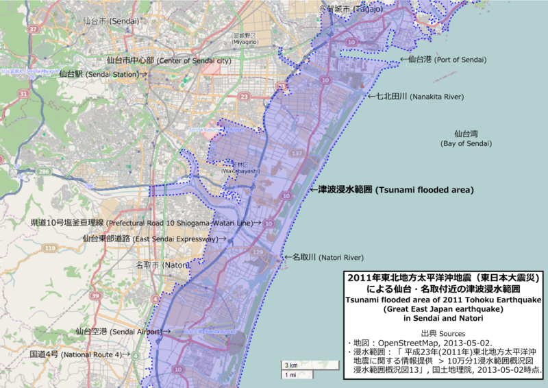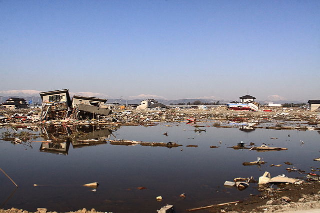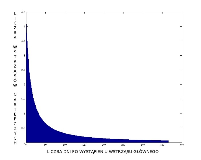 W lutym 2015 roku w okolicy Japonii zanotowano trzęsienie ziemi o magnitudzie 6.8, które było wstrząsem następczym trzęsienia ziemi z 11 marca 2011 roku o magnitudzie 9. To wielkie trzęsienie ziemi spowodowało powstanie tragicznego w skutkach tsunami (Fot. 1, Rys. 4), ale jego wpływ na procesy w skorupie ziemskiej się nie zakończył, ponieważ sekwencja wstrząsów następczych po prawie 4 latach ciągle trwa. W celu lepszego zrozumienia, dlaczego tak się dzieje trzeba najpierw poznać, czym jest sekwencja sejsmiczna. Na sekwencję składają się wstrząsy poprzedzające (foreshocks), wstrząs główny (mainshock) i wstrząsy następcze (aftershocks). Wstrząsy poprzedzające wstrząs główny to słabsze trzęsienia ziemi, które zlokalizowane są blisko epicentrum wstrząsu głównego i występują w dosyć krótkim czasie przed jego wystąpieniem. Nie każdy wstrząs główny ma wstrząsy poprzedzające. Wstrząs główny to najsilniejsze zjawisko w sekwencji, po którym prawie zawsze następuje seria wstrząsów następczych. Te z kolei są słabsze od wstrząsu głównego i występują w odległości od 1 do 2 długości rozrywu, który spowodował wstrząs główny. Generalna zależność jest taka, że im większy wstrząs główny tym występuje więcej wstrząsów następczych i o większej magnitudzie oraz dłużej ta seria trwa. W bardziej naukowy sposób wstrząsy następcze i zależność ich liczby w czasie po wstrząsie głównym opisuje tzw. prawo Omori, które obecnie funkcjonuje w postaci zmodyfikowanej przez Tokuji Utsu w 1961 roku:gdzie K, c oraz p to stałe, t to czas jaki upłynął od wstrząsu głównego a N to liczba wstrząsów następczych. Stałe K i c zależą od charakterystyki danego regionu i sekwencji, a stała p zazwyczaj zawiera się pomiędzy 0,7 a 1,5. Graficzna ilustracja tej zależności jest pokazana poniżej (Rys. 3).
