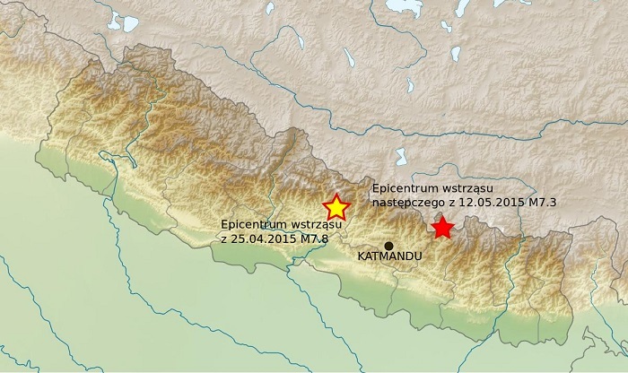 Rys. 1. Lokalizacja wstrząsu głównego i najsilniejszego wstrząsu następczego w Nepalu (12 maja 2015 roku). Źródło: Wikipedia, autor oryginału: Uwe Dedering, Modyfikacje Grzegorz Lizurek.