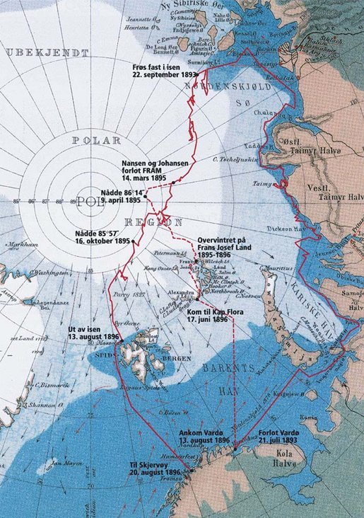 Nansen w 1893 roku zorganizował wyprawę, która miała polegać na celowym doprowadzeniu do wmarznięcia statku w lody w rejonie wschodniej Syberii, i traktując go jako bazę, przepłynięcia nim przez Morze Arktyczne, a może nawet trafienia w ten sposób na biegun północny. Ta wyprawa odniosła sukces – po dwóch latach statek Nansena „Fram” (Fig. 2.) wymarzł z lodów w rejonie cieśniny, pomiędzy północnym Spitsbergenem a Grenlandią, noszącej obecnie nazwę cieśniny Fram i bezpiecznie powrócił do Tromsø. Nie udało się natomiast zdobyć bieguna – trasa dryfu „Frama” prowadziła około 400 mil od bieguna. Nansen z towarzyszem podjął próbę dotarcia do bieguna po lodzie, korzystając z psich zaprzęgów (psy zostały zabrane na statek z taką właśnie myślą). Próba nie powiodła się, Nansen zawrócił z drogi na biegun, dotarł do Ziemi Franciszka Józefa i na południe od archipelagu natrafił na rosyjskie statki, które zabrały go na ląd (Fig. 3.).