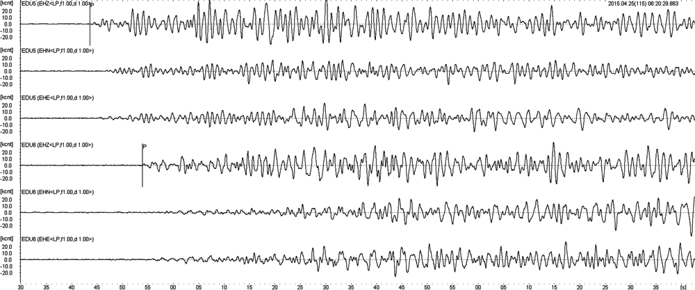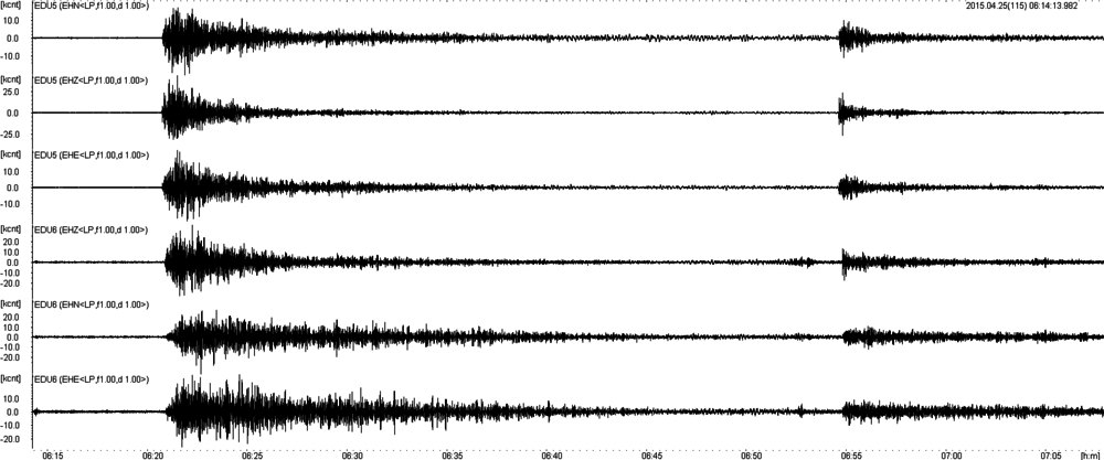 Rys. 1. Zapis wstrząsu głównego i silnego wstrząsu następczego z Nepalu z dnia 25 kwietnia 2015 roku na stacjach edukacyjnych monitoringu sejsmicznego EDUSCIENCE.