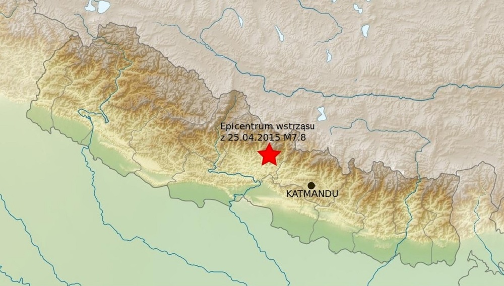 Rys. 3. Lokalizacja epicentrum wstrząsu głównego o M7.8. Źródło: Wikipedia, autor oryginału: Uwe Dedering, modyfikacja: Grzegorz Lizurek.