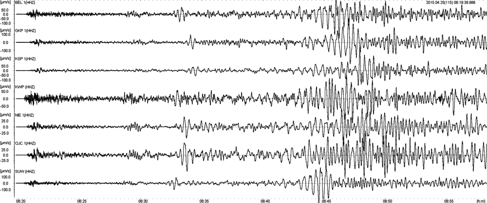 Rys. 4. Zapis wstrząsu z 25 kwietnia 2015 roku, M7.8 na stacjach PLSN.