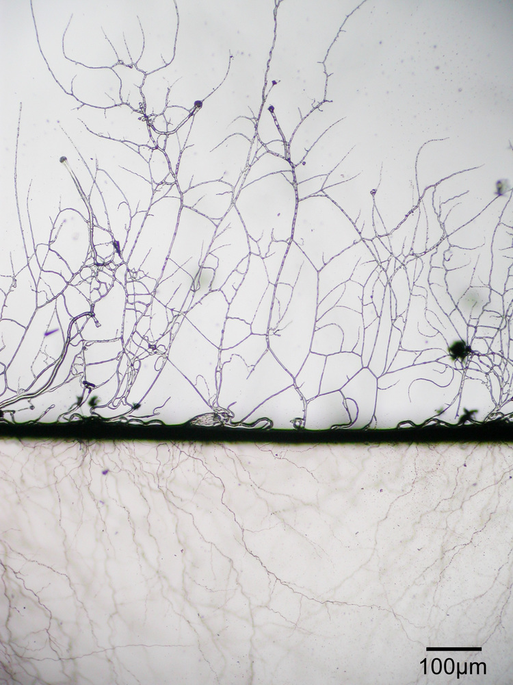 Oto grzyby pleśniowe widoczne w powiększeniu – grzybnia (z lewej) i strzępki (z prawej) kropidlaka czarnego.