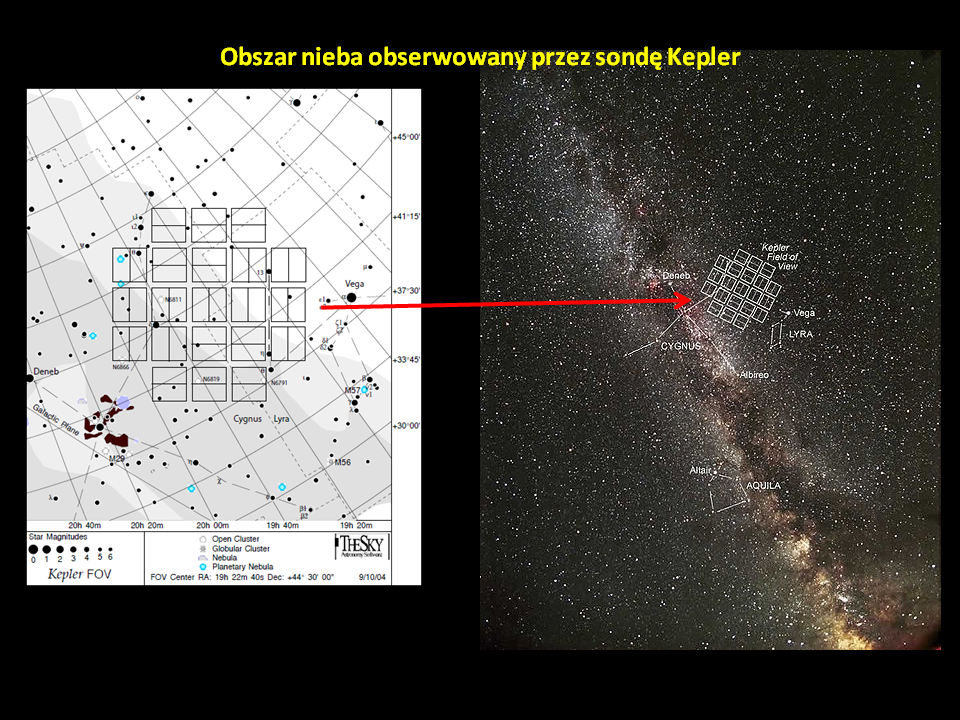 Kepler obserwuje niewielki obszar nieba (ok. 100 000 gwiazd) w pobliżu gwiazdozbioru Łabędzia (łac. Cygnus) oraz Lutni (łac. Lyra) (Grafika 2). W swojej pracy sonda wykorzystuje jedną z głównych metod odkrywania planet, mianowicie zjawisko tzw. tranzytu (Grafika 3), czyli przejścia obiektu na tle obserwowanej gwiazdy. Kiedy jakiś obiekt, nawet niewielkich rozmiarów przesłania obserwowaną gwiazdę, spada jej jasność. Na tej podstawie sonda Kepler odkryła już 132 planety (Grafika 4). Kolejne 3216 obiekty to kandydatki na planety.